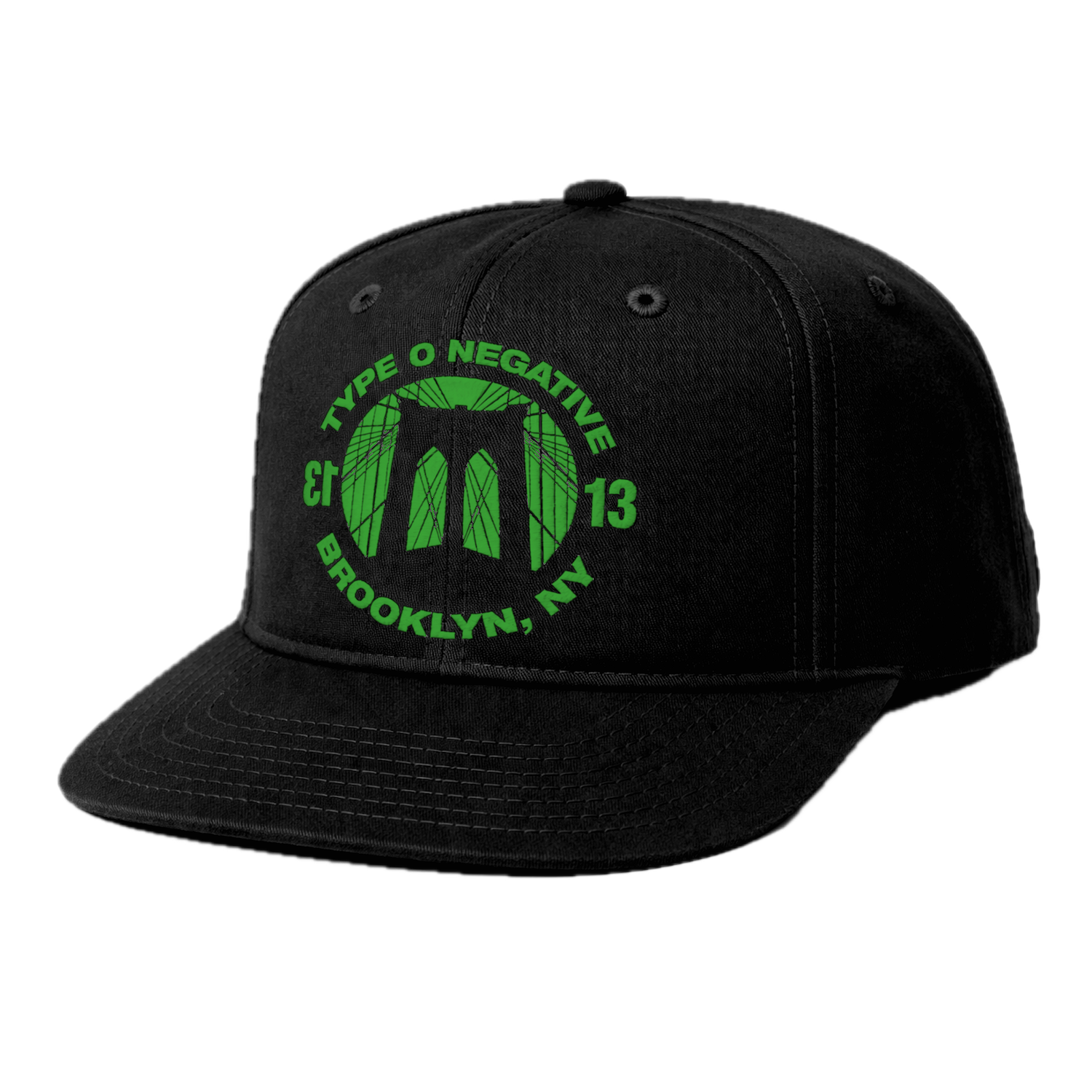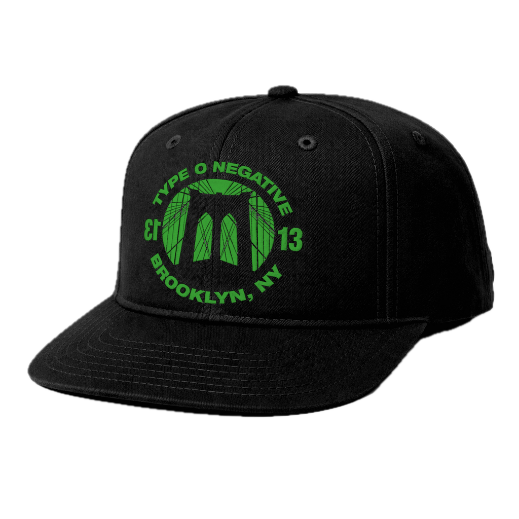 Black, snap back style hat with green embroidered Brooklyn Bridge on the front.