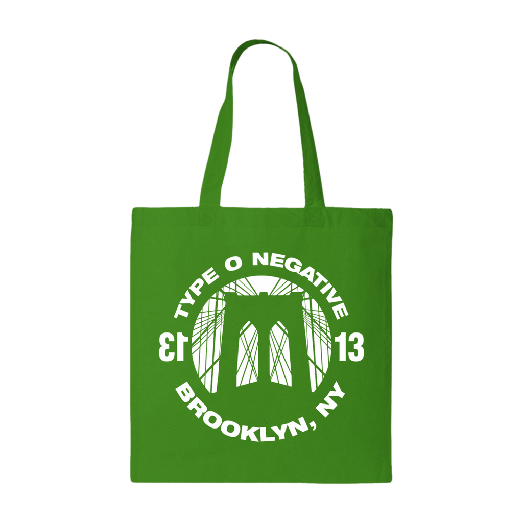 Lime green colored Type O Negative tote bag with a white Brooklyn Bridge graphic.
